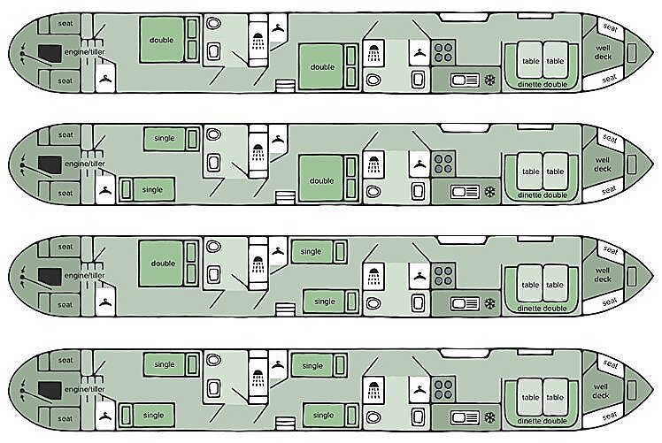 Thrush, en av de mest uppskattade kanalbåtarna i England, har plats för upp till 6 personer (samma layout som Lark). Båten är särskilt bekväm för 4 personer tack vare sina två separata hytter, båda utrustade med egen dusch och toalett. I salongen finns ytterligare bäddplatser för två personer. Hytterna kan möbleras med antingen dubbelsängar eller enkelsängar, vilket ger flexibilitet beroende på era behov. Salongens bäddbara sittgrupp gör det möjligt att enkelt skapa extra sovplatser, utan att kompromissa med komforten.